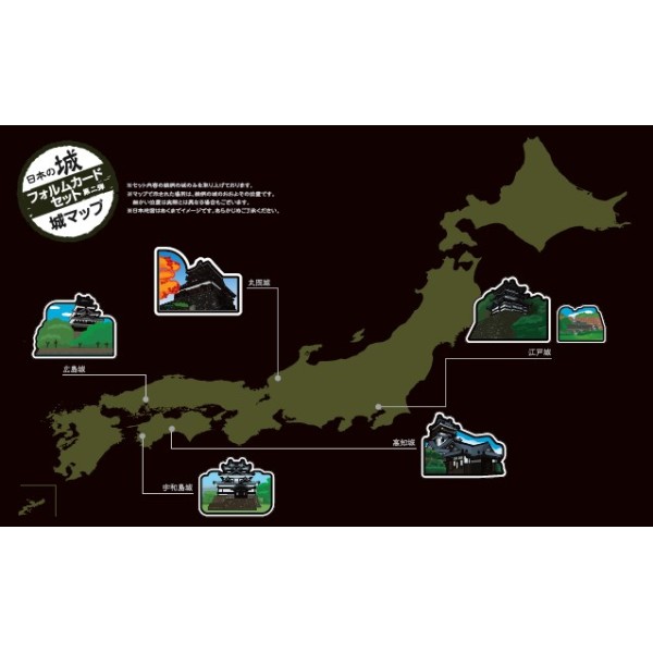 商品内容は、「フォルムカード5枚(170mm×133mm)と、「ミニカード1枚(63mm×80mm)のセットです。さらに、台紙表面は、絵柄イラストの城へのアクセスガイド、中面には、城マップが付いています。