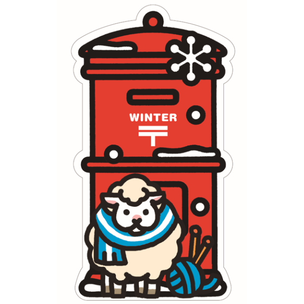 お手製のマフラーを巻いたヒツジが愛らしい、冬のポスト型はがきです。